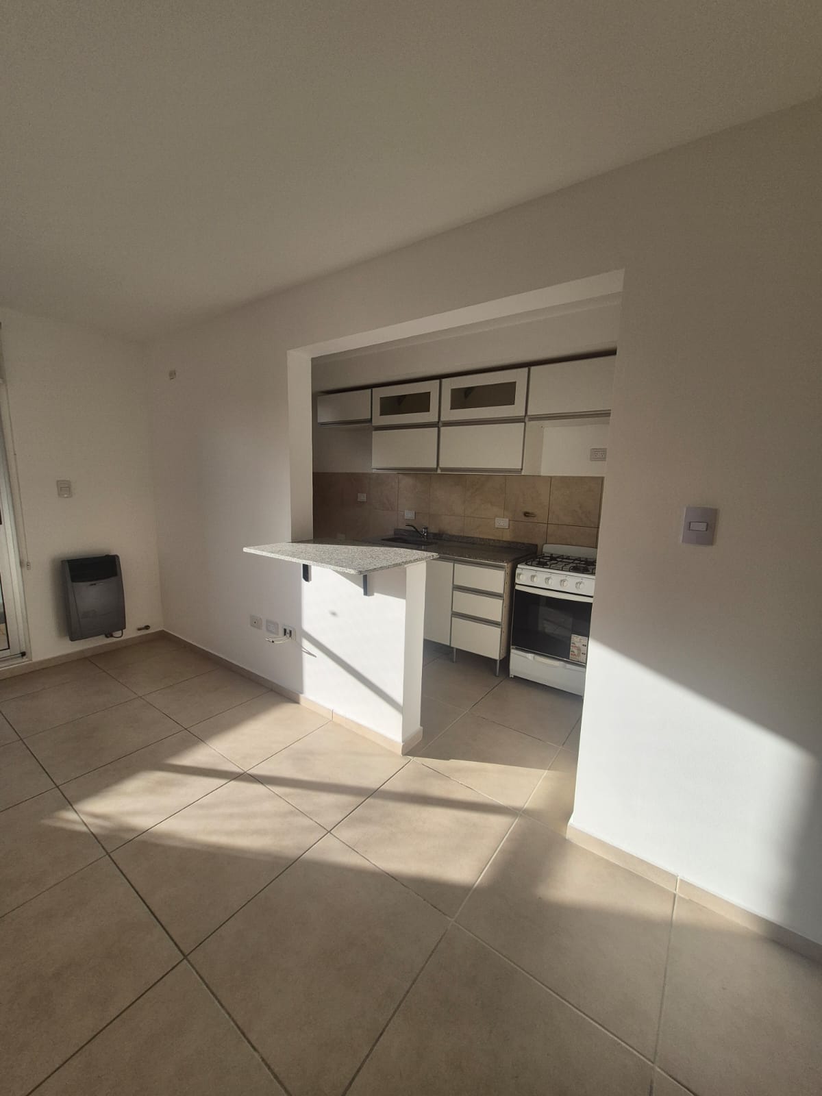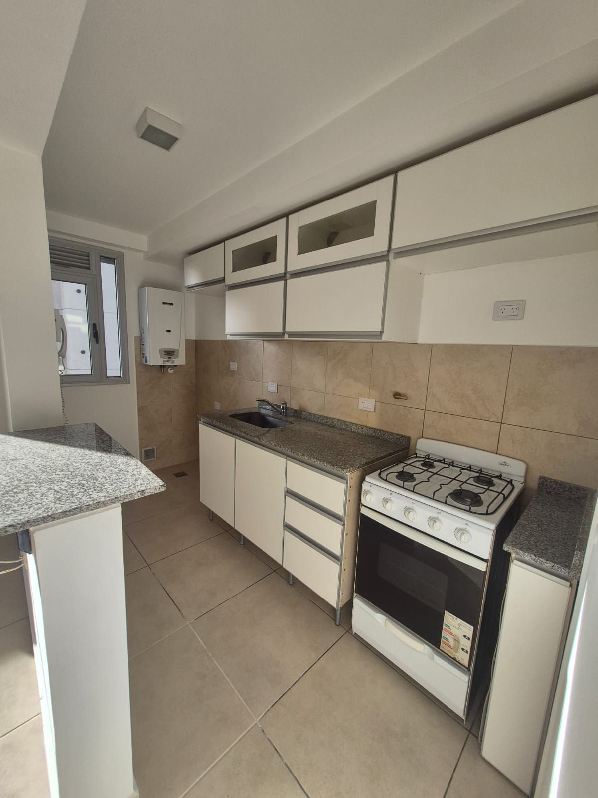 Cocina integrada con desayunador de granito con mueble bajo mesada y alacena